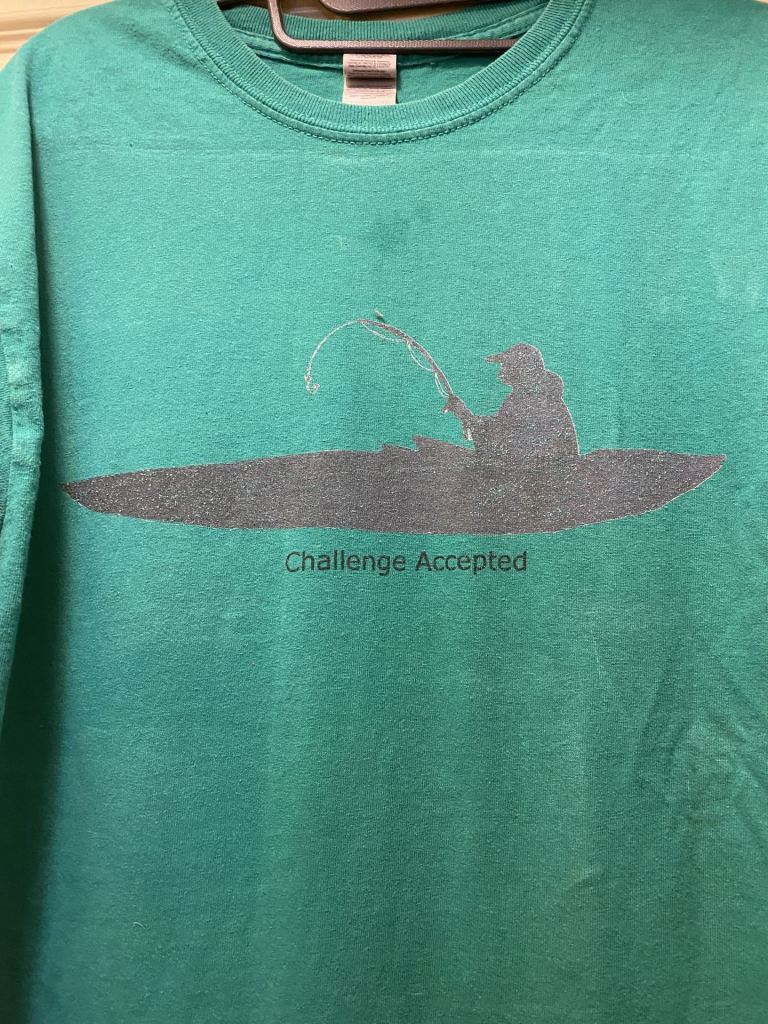 I illustrated this t-shirt for my brother who is a fishing fiend. I used my Wacom tablet and the Gimp program. I wanted to incorporate his desire to fish for hours in his kayak.