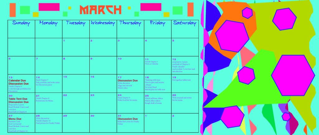 This is a calendar I made in InDesign. I wanted to use shapes and words to create a unique design. I decided to add the cat for added fun. ๐